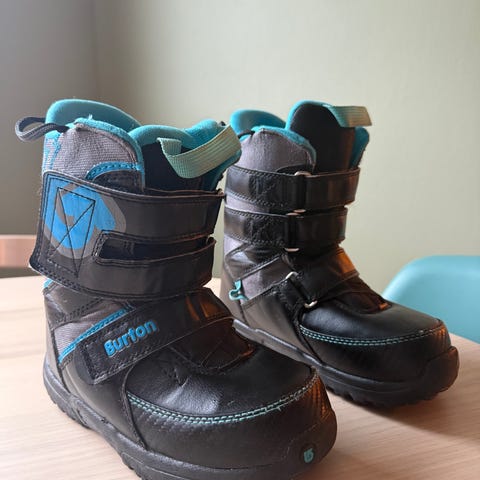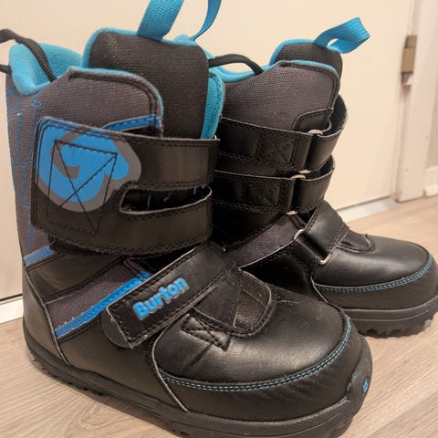 Burton Grom snowboardstøvler for barn i størrelse EU 33 (US 2, UK 1, JPN 20,5, CN 205). Modellen er laget for ungdom/barn og har borrelåslukking med to stropper for enkel justering og av/på. Overdelen er i syntetisk materiale med svart grunnfarge og blå detaljer, samt polstret innside i blått tekstil for komfort. Sålen har grovt mønster for godt feste på snø og is.