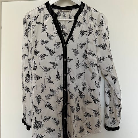 Blusen er pent brukt. Str. 38. Brystmål fra armhule til armhule er 48 cm, og hel lengde fra skulder og ned er 67 cm. 97% bomull og 3% elastan.