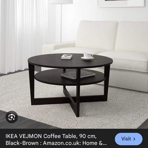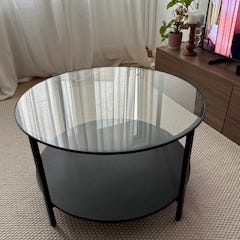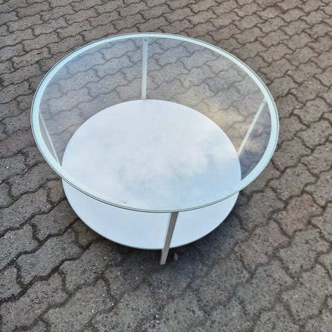 IKEA Vittsjö rundt sofabord i svart metall med bordplate i glass. Bordet har to nivåer, med en øvre rund glassplate og en nedre rund hylle. Underhyllen gir ekstra oppbevaringsplass til for eksempel bøker, magasiner eller fjernkontroller. Nøytralt design som passer inn i ulike typer stuer og interiørstiler.