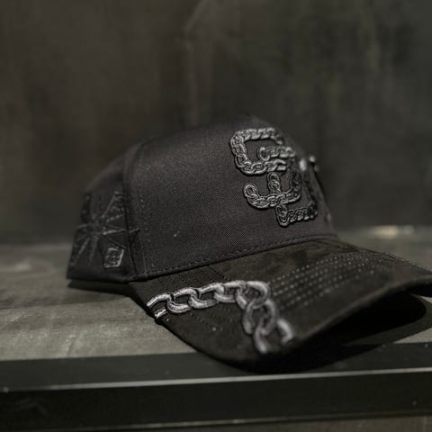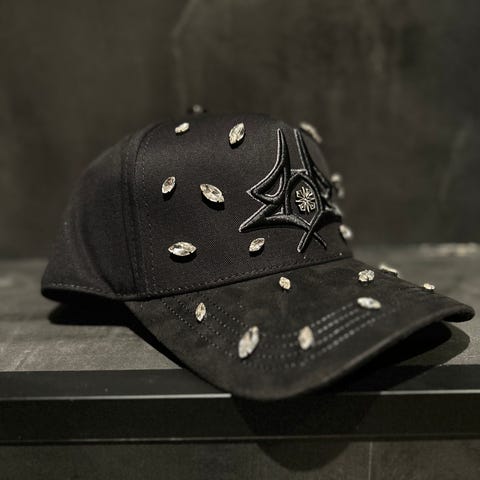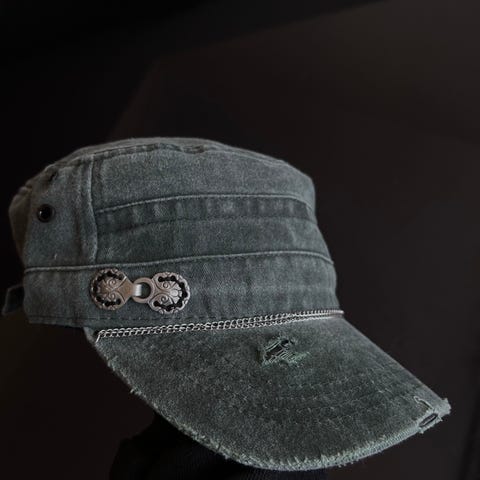 Håndbrodert caps på en slitt denim-caps. Sort tråd med sølvdetaljer (nagler, ringer). Mange arbeidstimer og unik! Er unisex men på den litt større siden.