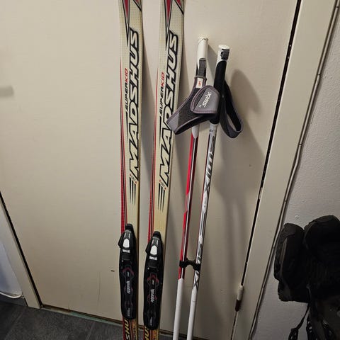 Madshus Super U MG langrennssk for barn med integrerte bindinger. Mener på de er rundt 100 cm i lengden.