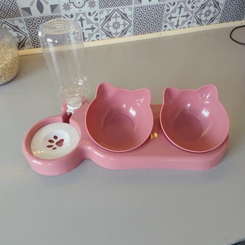 matskålsett til liten hund/ katt i beige plast. Settet består av et brett med to skåler, hvor den ene har potetrykk i bunnen. Størrelsen på brettet er 36,5 x 20,5 x 8 cm. Egnet til servering av både mat og vann. Skålene kan tas ut av brettet for enkel rengjøring.