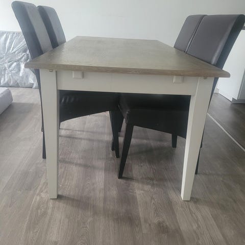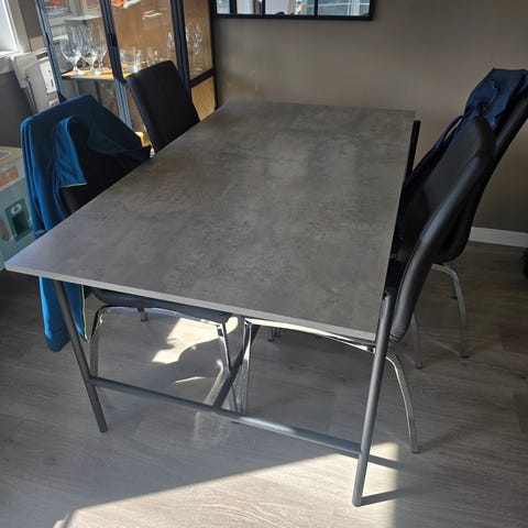 Spisebord med seks stoler. Rektangulært bord med bordplate i grå laminat med steinlignende mønster og understell i metall. Stolene er i grått tekstil og slanke ben i metall. Passer som spisegruppe i kjøkken eller spisestue.