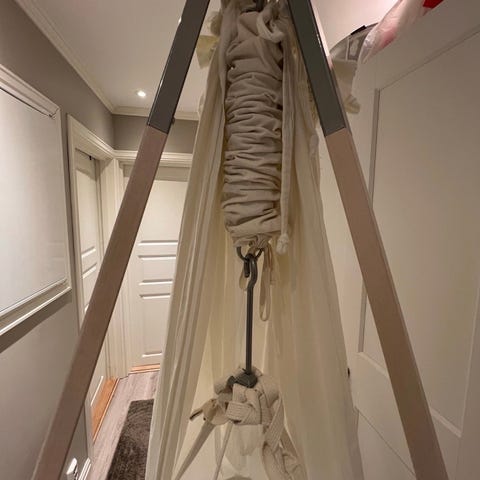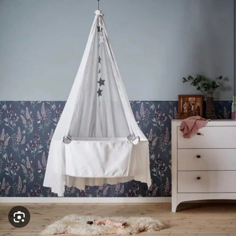Leander vugge for baby. Hengende vugge med stativ. Flere laken kan medfølge. Brukt med moonboon som selges i annen annonse