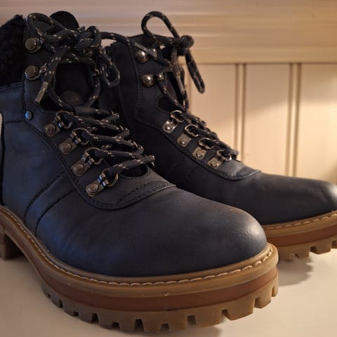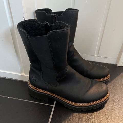 Rieker vinterstøvler i størrelse 38. Støvlene er svarte med snøring foran , glidelås på siden , og tekstilfôr øverst på skaftet. Grov yttersåle med integrerte røde pigger for bedre feste på glatt underlag. Egnet som varme og stabile vinterstøvler til hverdagsbruk.