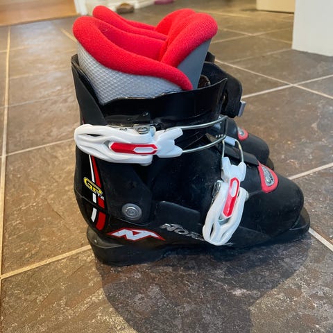 Nordica P Carve alpinstøvler for barn i svart med blå og grønne detaljer. Svært lite brukt. Str 160-175. Yttersåle 215 mm.