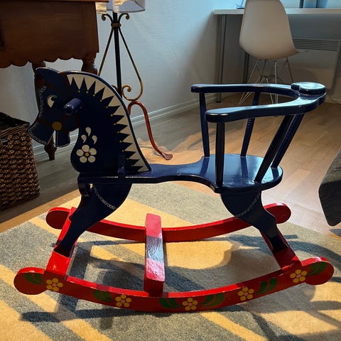 Robust gyngehest til små barn. Noe merker i lakken på utsatte steder ellers som ny.