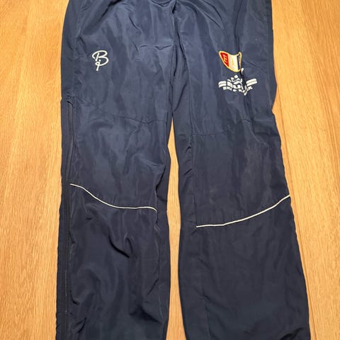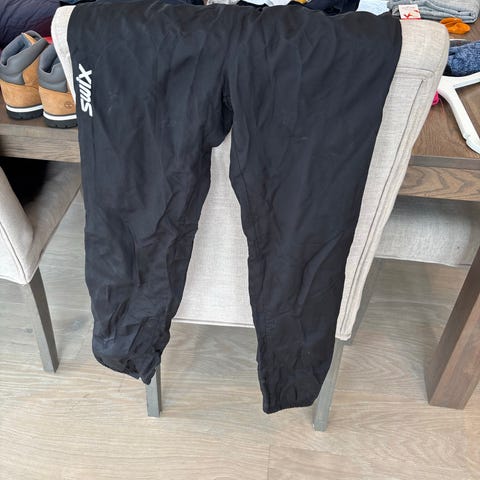 Swix junior treningsbukse i størrelse 140 (ca. 10 år). Buksen er svart og har elastisk linning i livet. Den har smale ben med strikk nederst. Egnet som trenings- eller overtrekksbukse for barn/junior, for eksempel til ski og annen utendørs aktivitet. Det finnes synlige slitasjemerker og små hull på stoffet, som vist på bildene.