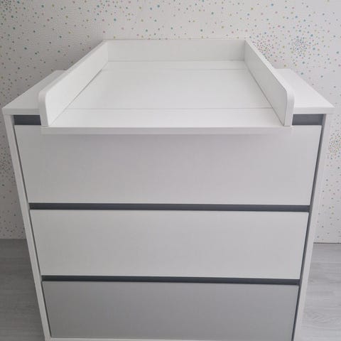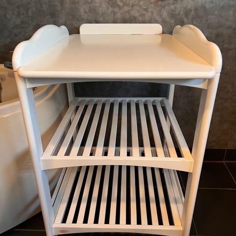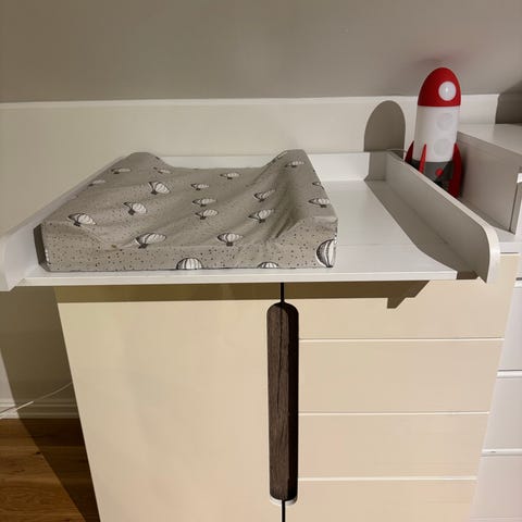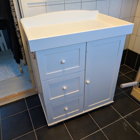 Retro kommode i heltre fra 1950 tallet med stellebord. Kommoden og en forhøyet kant rundt toppflaten som fungerer som stellebord. Trenger litt pussing og litt maling. Høyde 90 cm, bredde 84 cm og dybde 45 cm