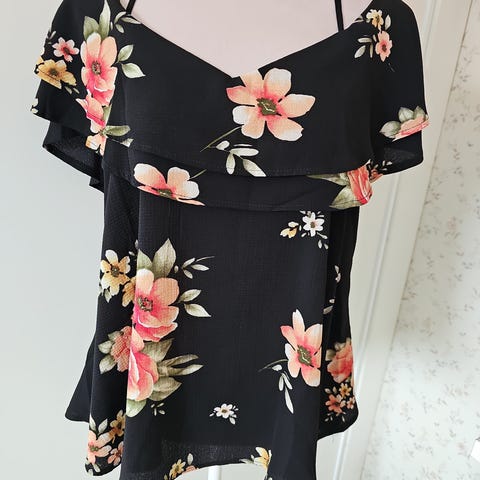 Kjempesøt og luftig sommertopp. Skulderstropper som kan justeres og ermer som henger lett ned på skulderen. Superfin fasong. Lett crepet stoff.