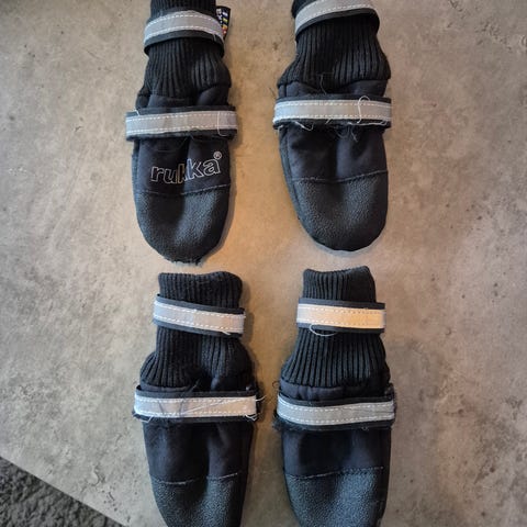 Helt nye Rukka potesokker str 3. Kun prøvd på men jeg har kjøpt en str for stor for min hund. Riktig str sitter som et skudd så sokkene erveldig gode og verner for vær vind og veisalt.