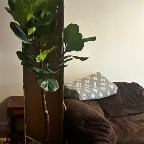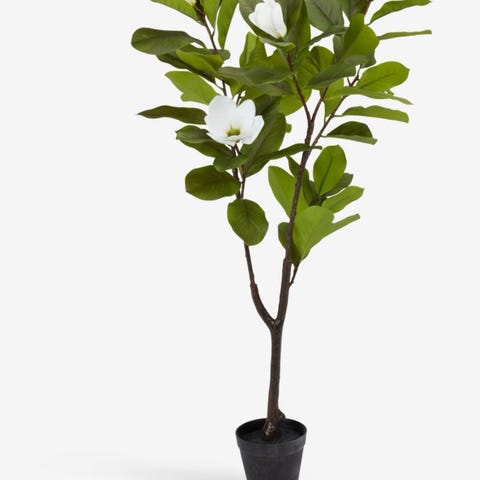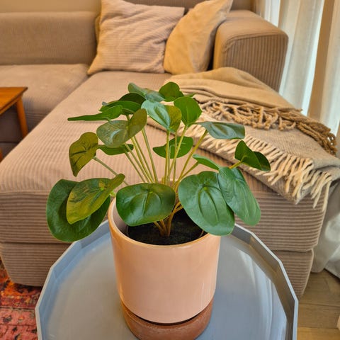 Kunstig grønn potteplante med store, avlange blader. Planten står i mørk potte og egner seg som dekorasjon innendørs. Passer i stue, gang, kontor eller andre oppholdsrom der man ønsker et grønt innslag uten vedlikehold.