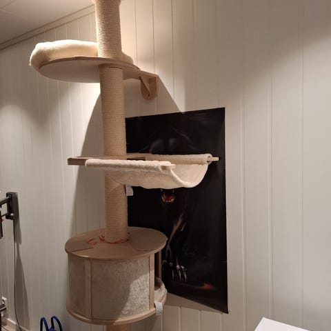 Kattetårn med to etasjer og kloreflate i beige tekstil. Produktet har to runde åpninger foran som gir katten tilgang til separate liggeplasser inne i tårnet. På siden er det en kloreflate som kan brukes til å skjerpe klør. Toppen er polstret og kan fungere som ekstra ligge- eller hvileplass for katten. Egner seg som liggeplass, gjemmested og kloremøbel.