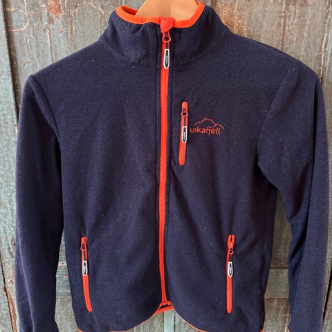 Vikafjell jakke for barn i størrelse 140. Jakken er blå med hel glidelås foran og to glidelåslommer i siden. Den har høy krage og lange ermer med strikk ved håndleddene. Egnet som mellomlag eller lett ytterlag til ulike aktiviteter og hverdagsbruk.