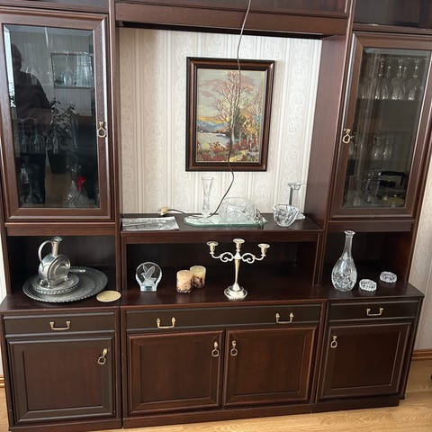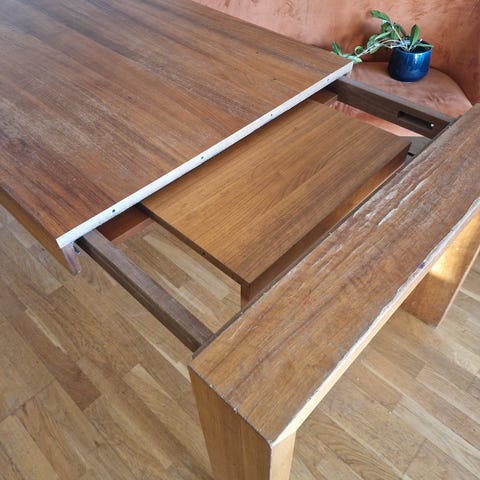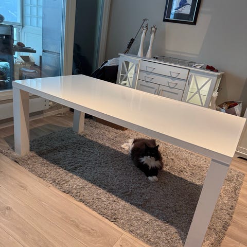 Dette solide spisebordet er opprinnelig brunt, nå er det malt med fargen «serengeti». Malingen har flakket av flere steder, i tillegg til at det er gnagd på av to valper. Er du en som liker å pusse opp og sette i stand ting, så har dette massive spisebordet potensiale! I såfall må du komme og hente det (selvfølgelig helt gratis).