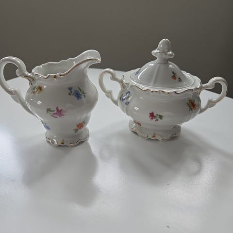 Melkemugge og sukkerskål av eldre årgang. Stemplet under med " Porsgrunn Norge" og merket "Vega". Koselig sett med nydelig blomstermotiv. Pent brukt uten skår eller krakelering. Selges samlet.