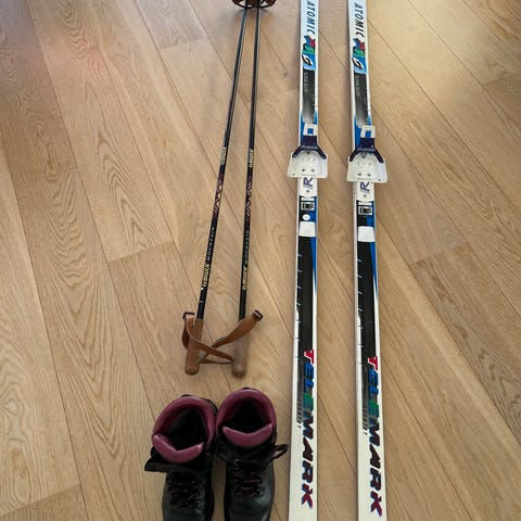 Madshus skisko i svart farge. Modellen har høyt skaft for bedre ankelstøtte og snøring foran. Sålen er tilpasset moderne langrennsbindinger. Egnet til langrenn. Str 35. Skoene har ikke blitt brukt mye, men de er markert med tusj.