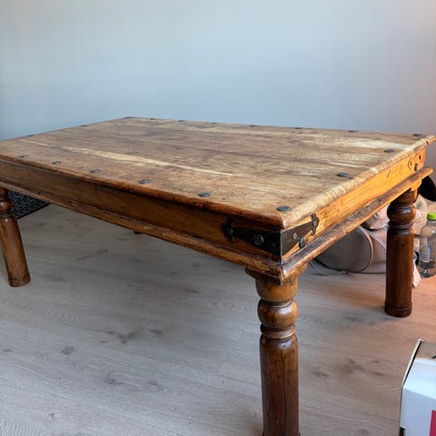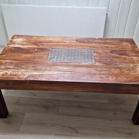 Gammelt stuebord i tre gis bort. Noen bruksmerker, og kan oppleves litt ustødig, men holder godt