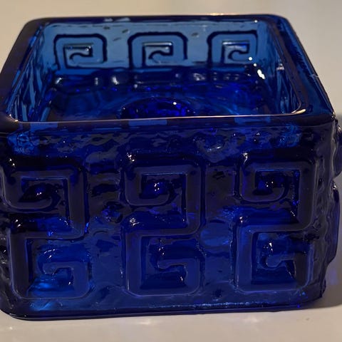 Søkeord: lysholder askebeger lysfat kubbelysholder kunstglass turkis lyseblå retro vintage glasskål skål glassbolle firkant kvadratisk.