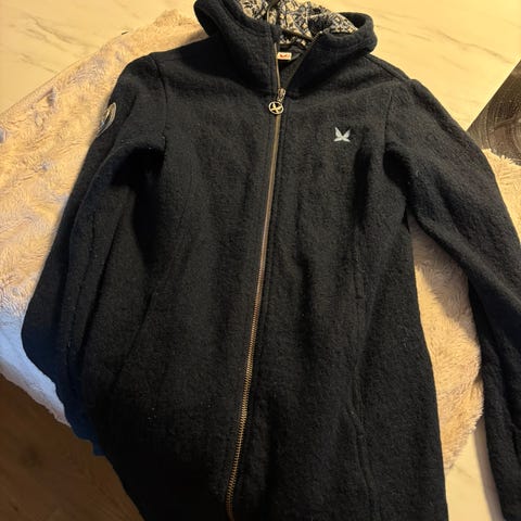 Deilig kåpe / lang jakke i ull fra Kari Traa i størrelse small. Luen er one size. Mørk blå med mønstret innside hette og matchende lue. Mønster rose. To frontlommer og glidelåsåpning.
