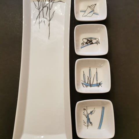 Porselensfat med blå kant og illustrasjoner, sett med 6