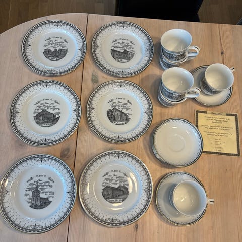 Sett med 6 porselensfat med dekorativ blå kant og gullfargede linjer. Midten av hvert fat har sort-hvite illustrasjoner med motiver av bygninger og miljøer, med tekst øverst i motivet. Fatene passer til servering eller som dekorative vegg- eller hylleobjekter. Sirkulær form og klassisk design med ensartet størrelse på alle 6 fatene.