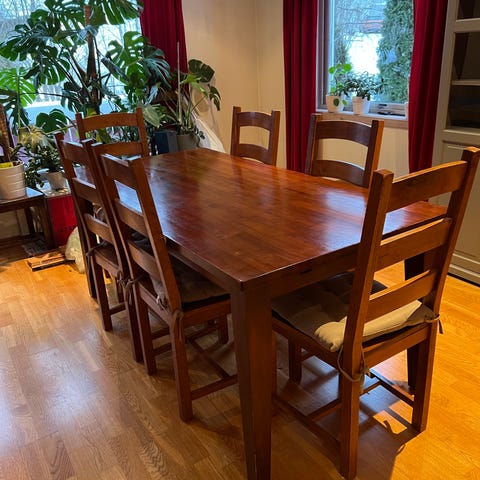 Bordet er av laminat og stolene bør vaskes/renses