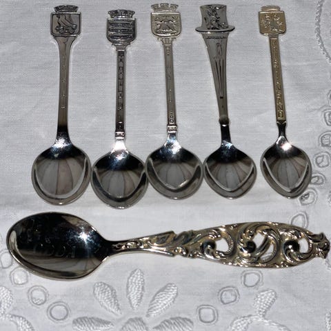 Souvenir teskjeer med norske by- og fylkesmotiv sølvfarget