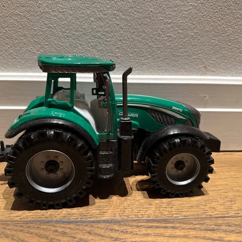 En grønn traktor med matchende tilhenger. Knapt brukt
