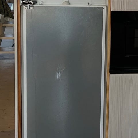 FROSTIG kjøleskap fra IKEA. Både kjøl og frys funker akkurat som de skal, vi har bare gått over til en annen størrelse. Størrelsen er ganske standard, så får nok plass i de fleste typer kjøkken. Må demonteres og hentes