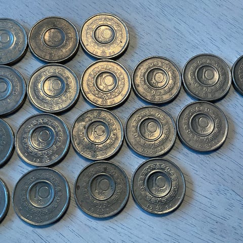 Samling med norske 10 -ører lagt ut på bordflate. Myntene har hull i midten og er av metall i sølvfarget utførelse. Egner seg til samling. 2stk 1940, 8stk1941, 1stk 1945 (kv 0/01) 4stk1946, 3stk 1947, 2stk 1948, 7stk1949 ( hvorav1stk kv 01) I alt 27stk. Kan sendes i posten mot porto.
