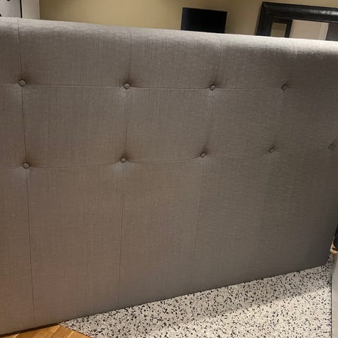 Sengegavl i lys beige tekstil. Gavlen har rette, enkle linjer og står på ben som løfter den noe opp fra gulvet. Passer bak seng for å gi støtte ved sitting og for å beskytte veggen. Nøytral farge som kan kombineres med ulike interiørstiler og sengetøy. Benhøyde 20 cm.
