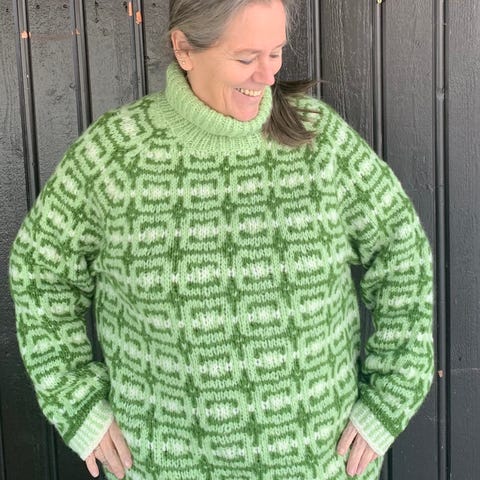 Den er strikket etter størrelse S, og er 114cm rundt kroppen. Jeg strikket dessverre for langt fra halsen til armhulene, og den er 29cm i stedet for 23cm. Dette gjør at ermehulene går under brystene mine, og er større enn det den skal være. Ellers er alle målene like som i oppskriften. Vil derfor anbefale genseren til en som bruker M/L, eller en S med større bryst.