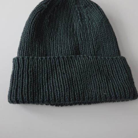 Ribbestrikket lue med bred, oppbrettet kant. Lua er brun og har figurnær passform.