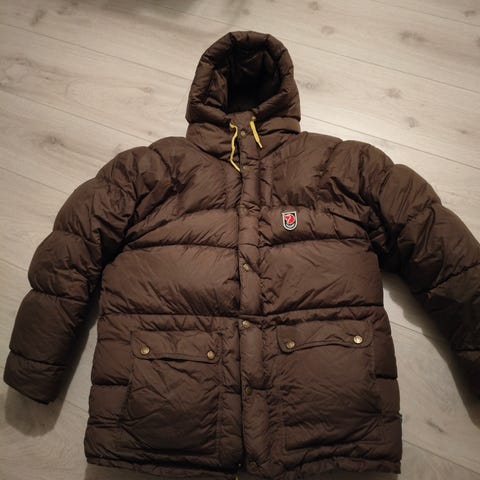 Fjällräven dun-vinterjakke for dame. Lang og innsvinget modell med hette. Jakken er foret med dun og har horisontale sømmer.