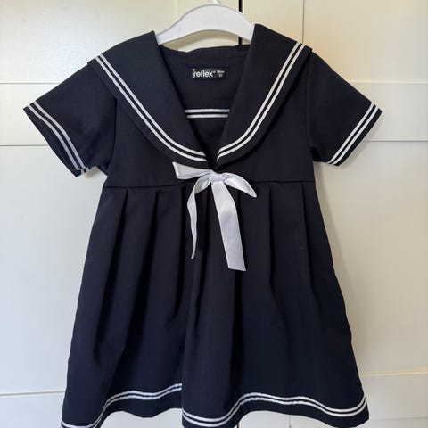 Marine,matros kjole str.4/5år . Belte og krage,gull knapper.