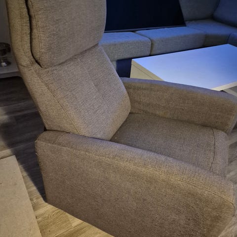 Lenestol recliner i svart kunstskinn. Stolen har polstret sete, rygg og armlener, samt innebygd fotskammel som kan felles ut for mer avslappet sittestilling. Egnet som lenestol i stue, TV-krok eller lesehjørne. Nøytral, mørk farge som passer inn i mange typer interiør.