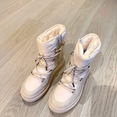 Jean Paul vinterstøvler i størrelse 39. Støvlene er brune med hvit yttersåle og glidelås foran. Innvendig er de fôret med mykt, lyst fôr som gir ekstra varme. Overdelen fremstår som syntetisk eller skinnlignende materiale, og sålen er grovmønstret for bedre grep på glatt underlag. Passer som varme vintersko til hverdagsbruk.