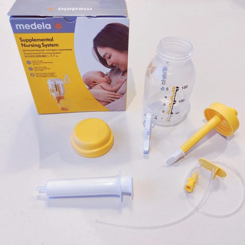 Medela ammestøttesystem. Systemet består av en beholder med måleskala, slange, klemme og tilbehør for kontrollert tilførsel av melk ved amming. Utformet for bruk sammen med bryst, slik at barnet kan få ekstra melk samtidig som det stimulerer melkeproduksjonen.