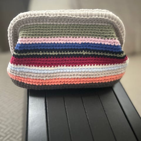 Clutchstoffveske for dame i brun farge. Vesken er heklet/strikket i kraftig stoffmateriale med strukturert mønster. Åpning øverst med metallramme som holder fasongen. Passer til oppbevaring av småting som sminke, toalettsaker eller tilbehør. Innside og utside er i samme stoffmateriale.