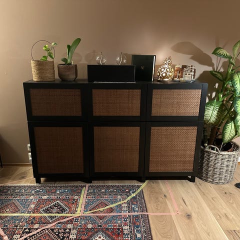 Massivt tre, rattan og folie. Soft close-dører. B148 x H85 x D45 cm