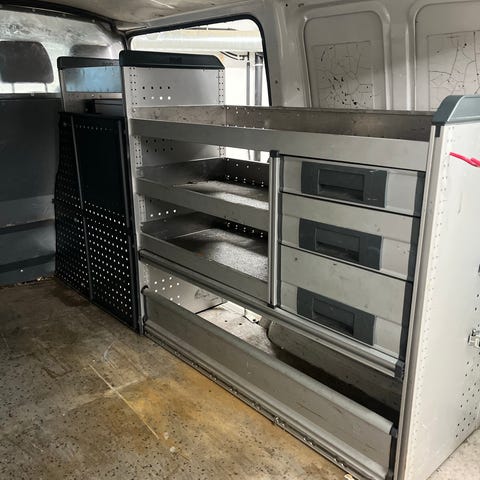 Innredningen består av flere hyller, skuffer og perforerte sideplater til montering i varebil. Hyllene er åpne med kantlister, og skuffeseksjonene har uttrekksskuffer i ulike høyder. Perforerte plater på sidene gir mulighet for feste av kroker og tilbehør. Systemet er egnet for organisering og oppbevaring av verktøy, smådeler og utstyr i varebil eller servicebil.
