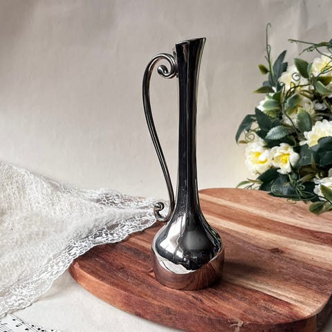 søkeord: sølv plett sølvfarge farge vase vaser hank håndtak blomstervase bordpynt borddekorasjon dekorering dekor pynt pyntegjenstand antikk vintage retro gammel gammeldags samler samle samleobjekt samleobjekter samling blomster rose gjennomsiktig blank