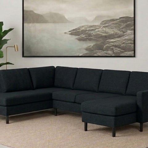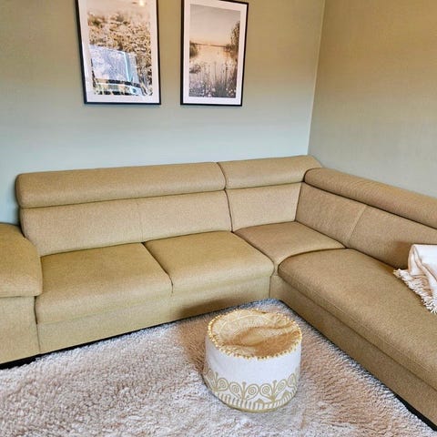 Sits hjørnesofa i tekstil. Sofaen består av to moduler som danner en romslig hjørneløsning med rette armlener. Den har løse sete- og ryggputer samt flyttbare nakkestøtter på enkelte sitteplasser. Passer til stue eller tv-stue der det er behov for mange sitteplasser. Stofftrekket har en vevd struktur som gir et nøytralt og tidløst uttrykk.