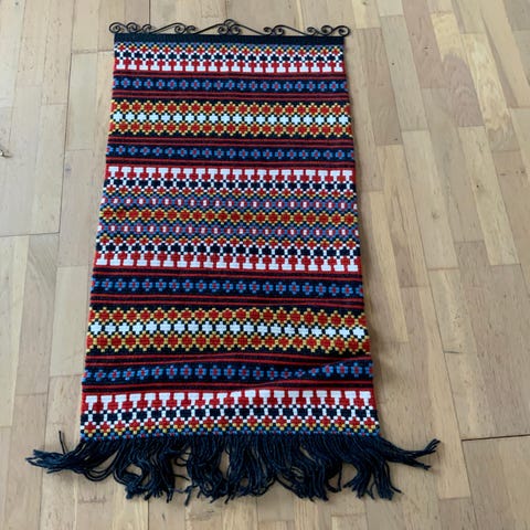 Veggteppe i tekstil med geometrisk mønster i flere farger, blant annet rødt, gult, oransje og rosa. Teppet har frynser nederst og oppheng øverst, og er egnet som veggdekor i ulike rom i hjemmet.