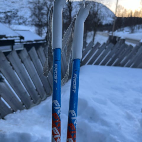 Skistaver i to ulike farger, ett par blå Frost skistaver 115 cm . og ett par hvite swix staver 105 cm selges kr 50,- pr par.