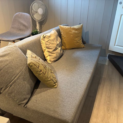 Sofaen må bæres ned en etasje, sengen kan monteres av.