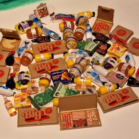 Blandet parti miniatyr tilbehør til dukkehus eller modellmiljø. Pakken inneholder ulike små gjenstander som dør, bardisk med barkrakker, flasker, mat- og drikkeimitasjoner, sjokoladeplater, kaker, spillkort, håndjern, små skilt og annet tilbehør. Delene er i ulike materialer som plast og tre, i forskjellige farger og størrelser. Egner seg til dekorasjon, hobbyprosjekter og innredning av dukkehus eller andre miniatyrscener.