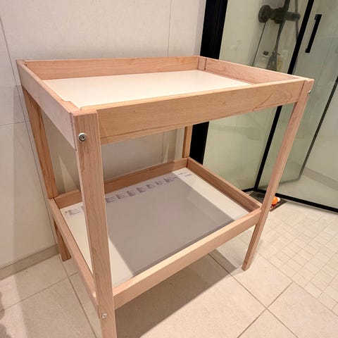 IKEA stellebord i kombinasjon av treverk og hvit overflate. Bordet har en øvre stelleflate med kant rundt, samt en nedre hylle for oppbevaring av bleier, kluter og annet utstyr. Egnet til stell av baby og små barn. Nøytralt design som passer inn på bad eller barnerom. - tekst generert av AI