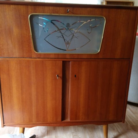 Retro skjenk fra 50-60 tallet selges for 500 kr. Ett av glassene er bristet, men ellers i god stand. Det er montert lys i skjenken.